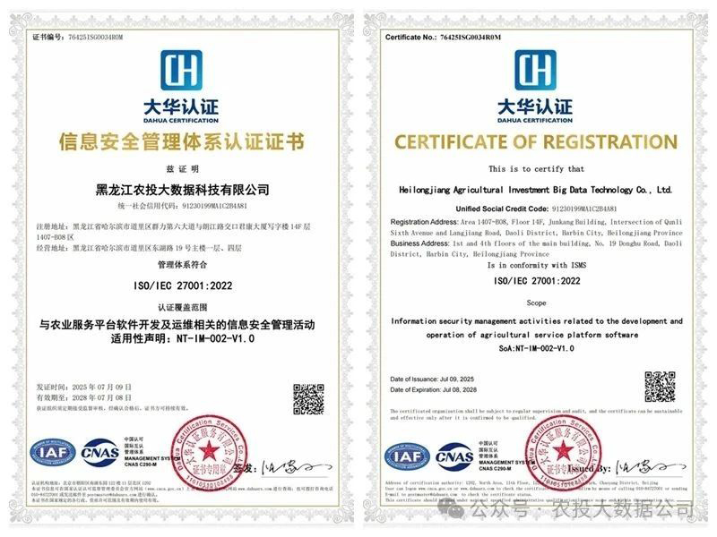 ISO/IEC 27001作为全球信息安全管理体系的权威标准,其核心在于建立系统化的安全策略、实施严格的风险管控、并确保数据在采集、传输、存储、处理、共享直至销毁的全流程中得到全方位保障。大数据公司成功获此认证,深度契合国家“强化数据安全、护航数字经济”的战略导向,以及黑龙江省大力发展数字经济、建设“数字龙江”、筑牢国家粮食安全网络防线的核心任务,为龙江数字农业的腾飞奠定了由国际标准认证的安全基石。